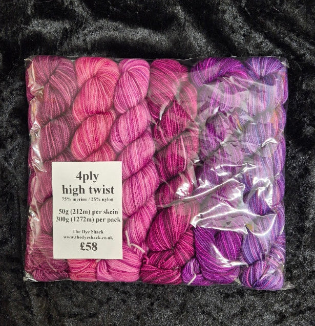 A beautiful 6 skein fade, each skein weighs 50g and is approx 212m. This set is dyed on the very lovely high twist base which gives stunning definition when knitted up.